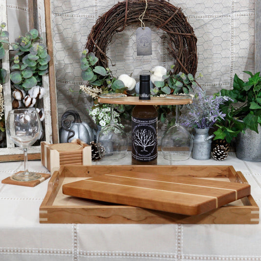 4-Piece Cherry Wood Tray, Cutting Board, Wine Carrier & Coaster Set