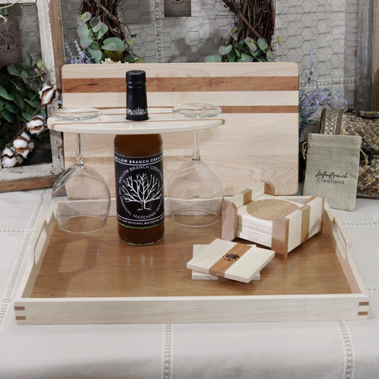 4-Piece Maple Wood Set: Tray, Cutting Board, Wine Carrier & Coaster Set